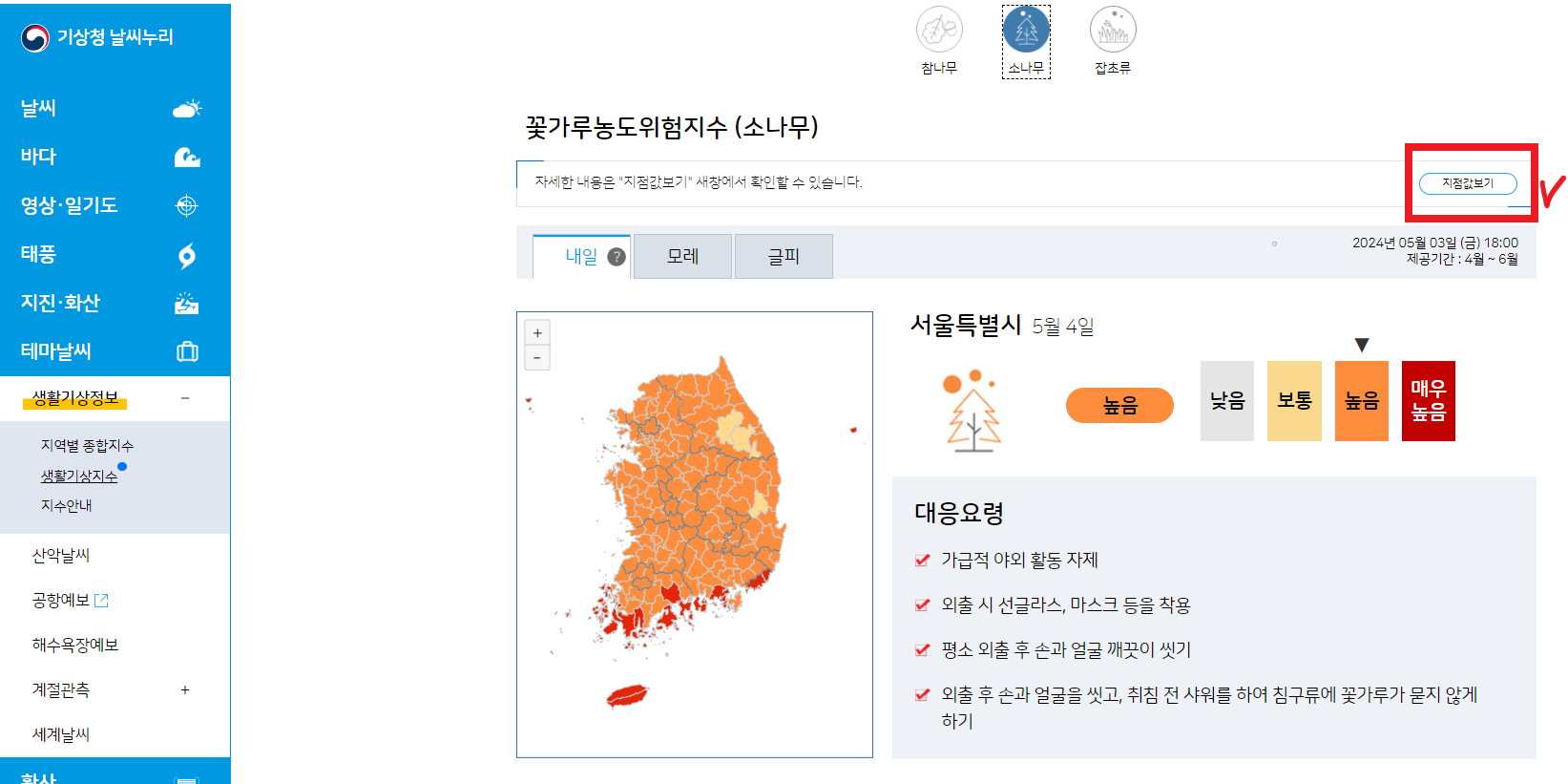 ※ 특히 소나무를 누르면 송화가루지수를 확인 가능하니 참고하시기 바랍니다.