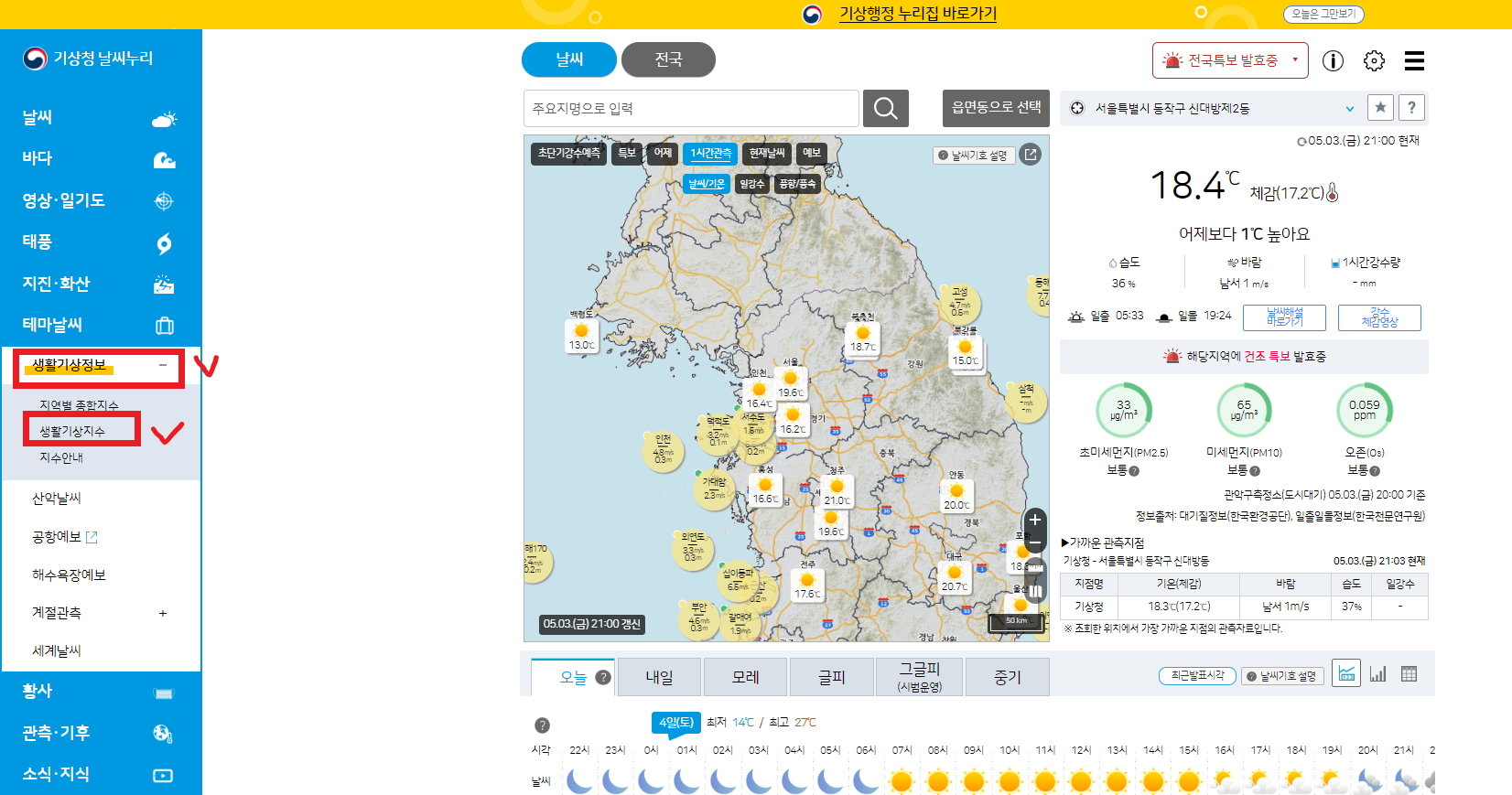 - 그 밑 메뉴 생활기상지수를 클릭합니다.