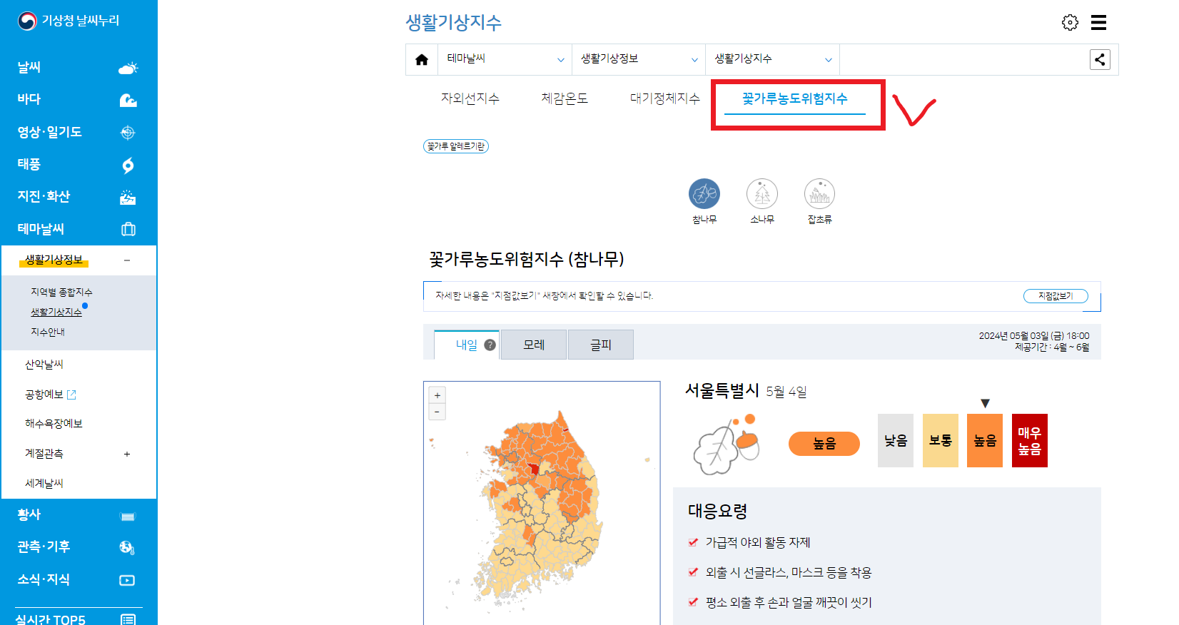 - 화면이 바뀌면 상단 오른쪽에 꽃가루농도위험지수를 클릭합니다.